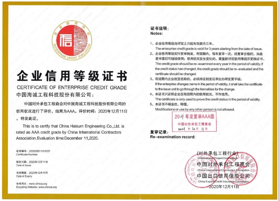 A few days ago, the 2021 International Contracting Project Enterprise Credit Rating Certificate was issued by China International Contractors Association, Haisum was awarded the title of "AAA-level Credit Enterprise".