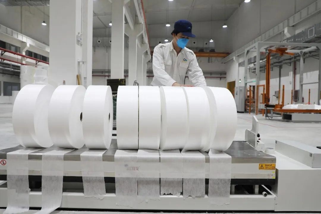 項(xiàng)目引(yǐn)進美國進口孖紡生產線,生產(chǎn)50~200gsm克重產品,運行車(chē)速為250m/min,年(nián)生產能力為8000~9000噸,是亞洲第一條孖紡高分子吸附新材料生產線。生產的(de)孖紡產(chǎn)品(pǐn)可廣泛應用於口罩、防護服、手術墊、護理墊、洞巾等醫療防護用品的過濾芯層,以及高檔濕巾、隔音隔熱材料(liào)等領(lǐng)域。