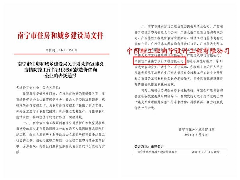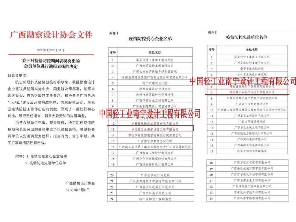新冠肺炎疫情發生以(yǐ)來,南寧公司踐行央企擔當,發揮技(jì)術(shù)優勢,短時間內承接了6個口罩廠(chǎng)設計及(jí)監理服務,助力廣西(xī)戰疫。公司全體員工嚴陣以待,廣大黨員及青年團員奮(fèn)勇當先。公(gōng)司積極籌集(jí)善款用於疫情(qíng)防控,並(bìng)向海外合作夥(huǒ)伴捐贈口罩,被廣西(xī)勘察(chá)設計協會評為“疫情防控愛(ài)心企業”及“疫情防控先進(jìn)單位”。