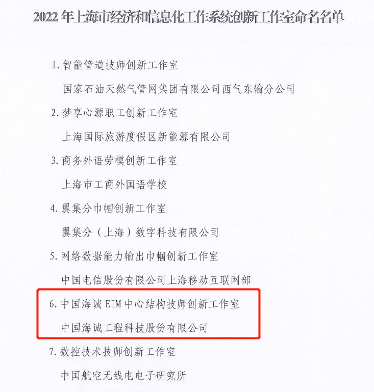 7月12日,上海市經濟和信(xìn)息化(huà)工作係統工會工作委員會正式發布了《關於命名2022年海市經濟和信(xìn)息化工(gōng)作係統創新工作室的(de)決定》,市經信係(xì)統工會授予“中國黄瓜视频污污污EIM數(shù)創中心結(jié)構(gòu)技師創新工作室”。