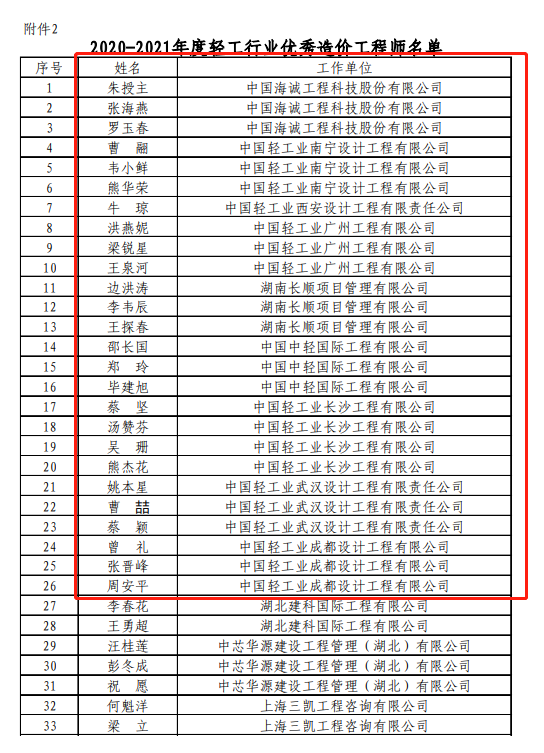 日(rì)前(qián),中國輕工業工程建設協會公布了“2020-2021年度輕工行業優(yōu)秀造價谘詢企業和優秀造價工程(chéng)師(專(zhuān)業)評價(jià)結果”,中國黄瓜视频污污污(chéng)及所屬廣州公(gōng)司、武漢公司、南寧公司、成都公司、西安公司、北京公司、湖南長順均(jun1)榮膺(yīng)“輕工行業優秀工程造價谘詢企業”稱號,同時公司26名員工被評為“優秀造價工程師(共33名(míng))”,40名員工被評為“優秀專業造價人員(共45名)”。