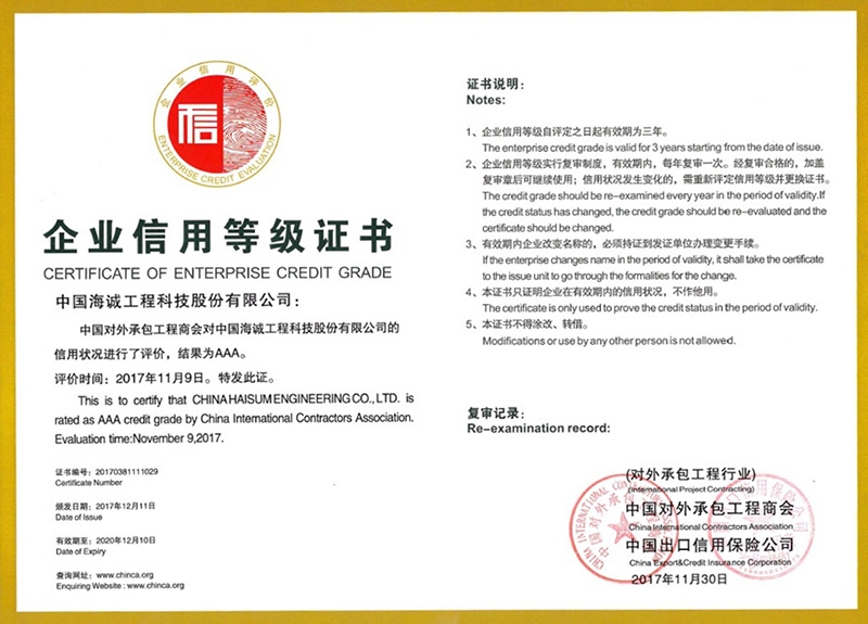 近日,在中國對外承(chéng)包工程商會和中國出口信用保險公司聯合(hé)舉辦的2017年度對外承包工程(chéng)企業信用等級評價中,公司又一次獲得“aaa級信用企業”稱(chēng)號。