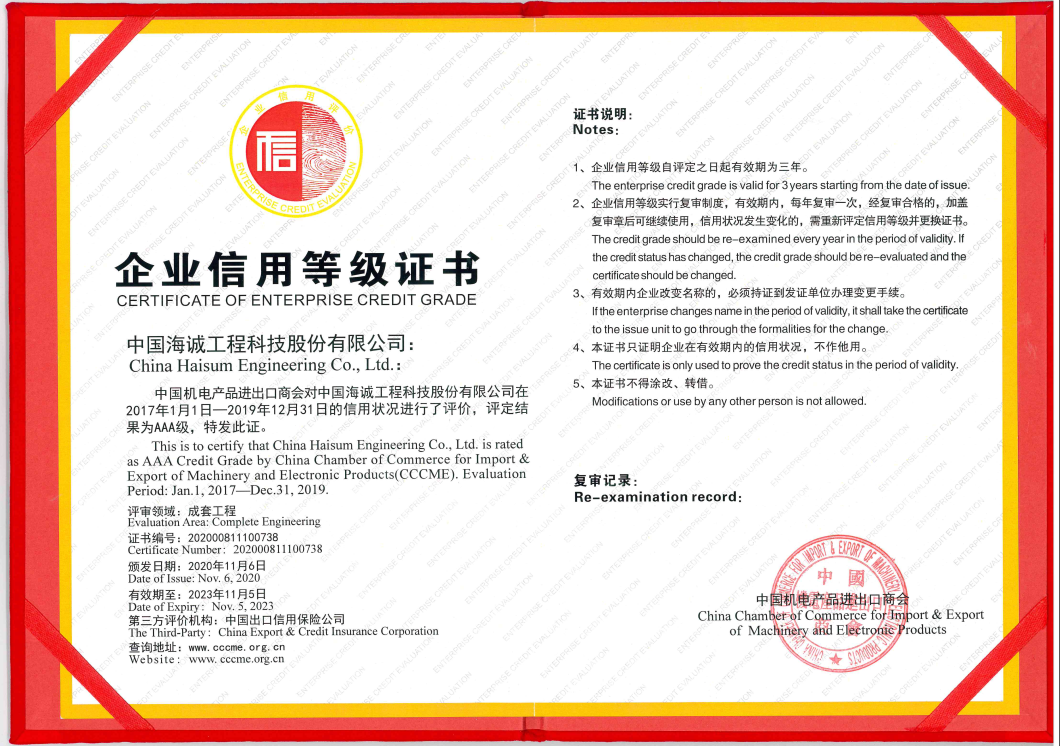 中國機電產品進出口商會作為我國機電產品進出口行業唯一的全國性商會,現有會員企業(yè)近(jìn)萬家,具有較強的行業代表性(xìng)。企業信用等級評價由商務部、國資委牽頭,中國出口信用(yòng)保(bǎo)險公(gōng)司作為第三方(fāng)評審機(jī)構,中國機電產品進出口商會(huì)進行複(fù)審。公司自2008年起參加中國機電產(chǎn)品進(jìn)出口商(shāng)會企業信用等級評價以來,已連續多年獲(huò)得AAA級信用企業稱號。獲得該榮譽,代(dài)表(biǎo)公司在成套工程領域有極高(gāo)的信用管理水平,為公司(sī)更好地“走出去”參(cān)與國際合作(zuò)與競爭發(fā)揮信用支(zhī)撐作用。