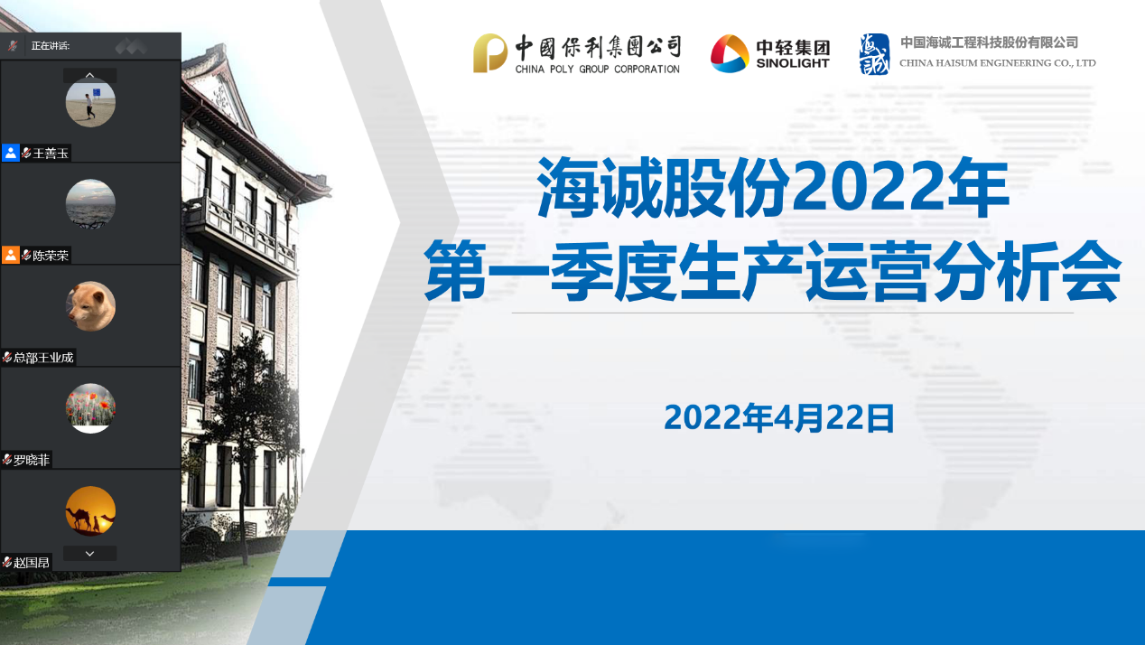 2022年4月22日,中(zhōng)國黄瓜视频污污污(chéng)以視頻形式召開2022年第一季(jì)度生產經營分(fèn)析會,深入貫徹保利中(zhōng)輕2022年(nián)一季度(dù)工作會決策(cè)部署,全麵總結一季度工作,研究部(bù)署下階段重點任務。中國黄瓜视频污污污黨委書(shū)記、董事(shì)長趙國昂視頻(pín)參會並作講話,黨委副書記、總裁陳榮榮主持會議。公司領導班子成員、總部部門負責人、上海本部和各子公司領(lǐng)導班子(zǐ)成員及財務、數字化、生產運營等相關人員在各分會場參加會議。