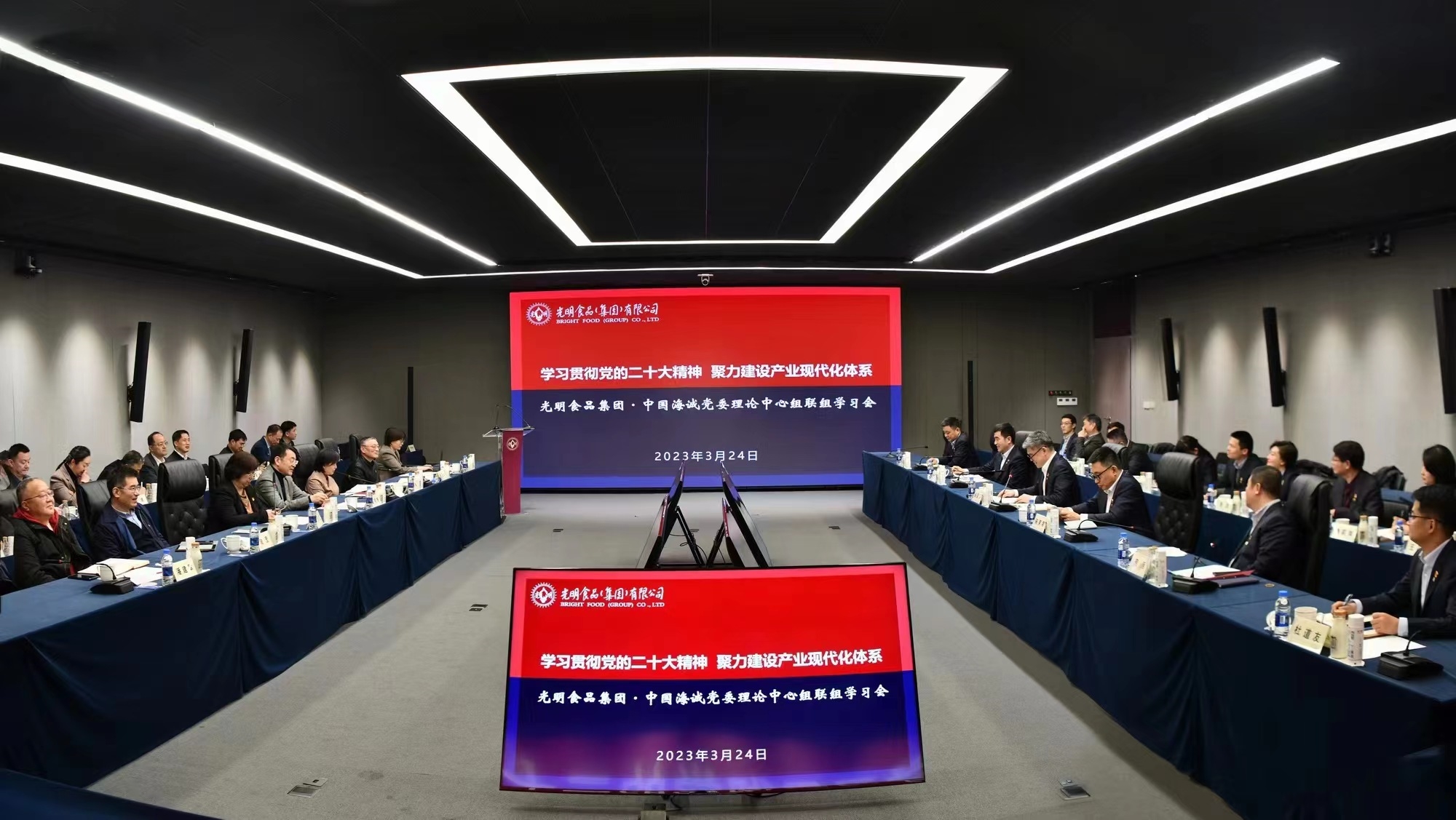 3月24日下(xià)午,中國黄瓜视频污污污和光明食品(pǐn)集團舉辦主題為“學習貫徹(chè)黨的二十大精神 聚力建設產業現代化體係”的黨委理論學習(xí)中心組聯(lián)學會。保利中輕副總經(jīng)理、中國黄瓜视频污污污黨(dǎng)委書記(jì)、董事長趙國昂,黨委副書記、總裁陳榮(róng)榮;光明食品集團黨委書記、董事長是(shì)明芳(fāng),黨委副書記、總裁徐(xú)子瑛,以及兩家企業領導班子成員,相關管理部門負責人等參加聯學活動。會議由(yóu)徐子瑛主持。