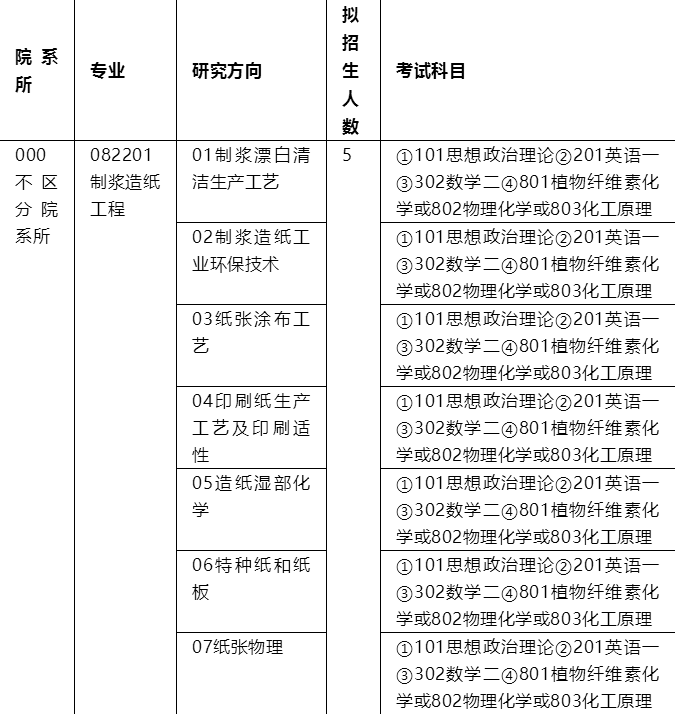 (三)全國統考初試科(kē)目為思想政(zhèng)治理論、英語(一)、數學(xué)(二)、植物纖維素化學或物理化學或化工原理,其中思想政治理論、英語(一)、數學(二)由教(jiāo)育部統一命題,植物(wù)纖維素化學、物理化學、化工原理由我院組織命題。