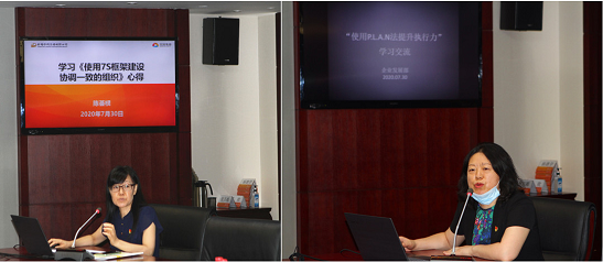 辦(bàn)公室主任陳薈(huì)欞圍繞徐念沙書(shū)記黨(dǎng)課(kè)和《使用7S框架建設協調一致(zhì)的組織》課程內容,結合中輕集團宣傳冊製訂工作分享學習心得;總經理助理、企業發展部主(zhǔ)任肖(xiāo)丹圍繞徐念沙書記黨課和《使用PLAN法提(tí)升執行力》課程內容,結合中輕集團戰(zhàn)略規劃編製工作與大(dà)家進(jìn)行(háng)充分交流。