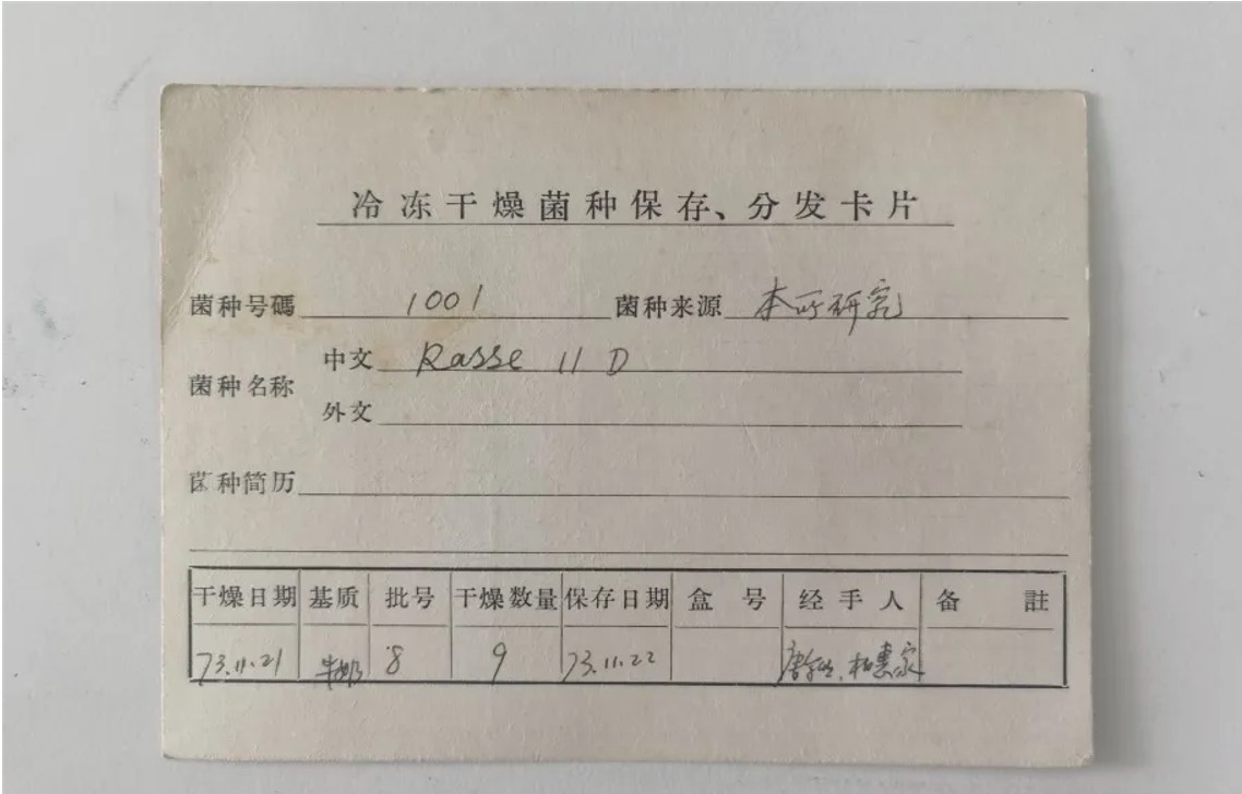 1973年製備的釀酒酵母1001的凍幹管保藏卡片