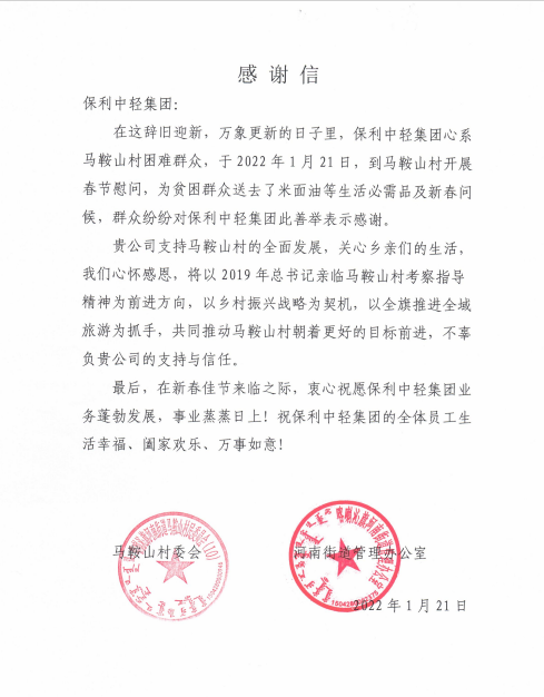 2022年,保(bǎo)利(lì)中輕將進(jìn)一步貫徹落實好中央有關精神,紮實推進鞏固拓展脫貧攻堅成果同鄉村振(zhèn)興(xìng)有(yǒu)效銜接,踐行(háng)央(yāng)企社會(huì)責任,以(yǐ)優異的幫扶成果向黨的(de)二(èr)十大獻禮。