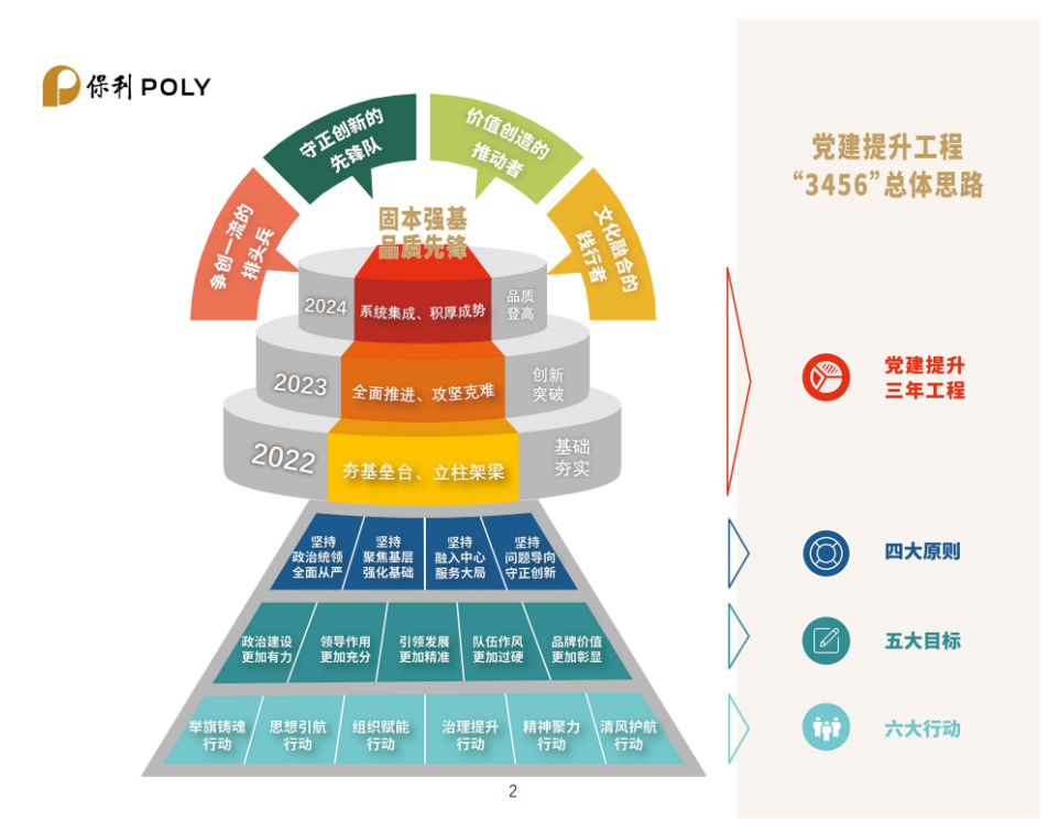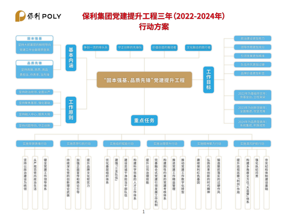 編者按(àn):12月22日,保利集團在京召開學習貫徹黨的(de)十九屆六中全會精神暨2022年度黨建(jiàn)工作會,會上正式發布了《保利集團“固本強基、品質先鋒”黨建提升工程(chéng)三(sān)年(2022-2024年)行動方案》(以(yǐ)下簡(jiǎn)稱“《方案》”)。為貫徹落實《方案》,保利中輕迅(xùn)速組織傳達學(xué)習,並(bìng)特別策劃《黨建(jiàn)提(tí)升 保利中輕在行動》專題,計劃持續定期報道保利中輕貫徹落實情況,旨(zhǐ)在帶領全體幹部(bù)員工一同認真學習、深刻領會,切實落實《方案(àn)》要(yào)求,突出(chū)抓基(jī)層強基礎,推動黨建工作提質增效、邁上新台階,以高質量黨建引領保障保利中輕高(gāo)質量發展,為(wéi)保(bǎo)利集團建設世界一流,追求卓越(yuè),貢獻中輕力量。今天(tiān)第一期,一起來學《方案》的(de)主要內容。
