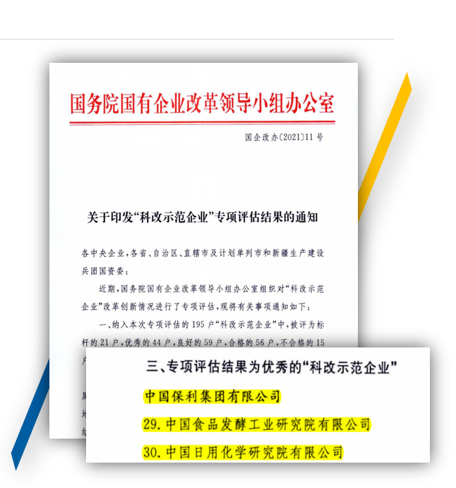 早在2020年4月,中國食品發酵工(gōng)業研究院和中(zhōng)國日用(yòng)化學工業研究院便(biàn)入選 “科改(gǎi)示範企業”名單。兩家企業(yè)圍繞科技創新(xīn)和市場化改革兩個維度,不斷(duàn)增(zēng)強(qiáng)“科(kē)改示範企業”的(de)發展動力、潛力、活力,全麵釋放(fàng)改革紅利,在2021年“科改示(shì)範企業”改(gǎi)革創新專項評估中均被國務院國資委評為優秀。
