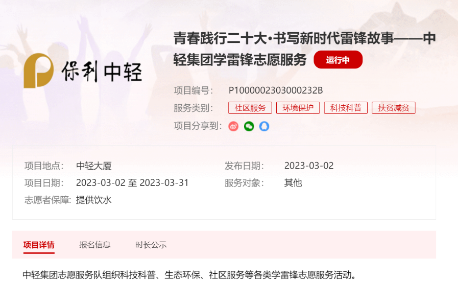 保利中輕總部(bù)組織建(jiàn)立青年誌願服(fú)務隊(duì),牽頭(tóu)開展學雷鋒係列主題活動。指導廣大團員青年進行注冊並加入團隊,號召廣大團員青年立足崗位、敬(jìng)業奉(fèng)獻,接續傳承服務人民、助人為(wéi)樂(lè)的(de)雷(léi)鋒精神。