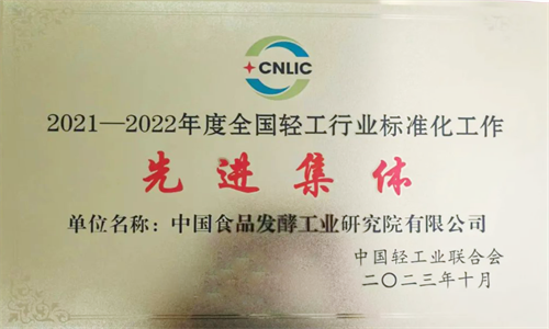 中國食品發酵工業(yè)研究院榮獲“2021-2022年度全國輕工行業標準化工作(zuò)先進集體”稱(chēng)號。