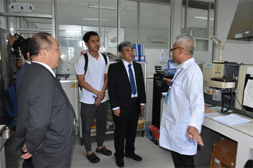 曹春昱一行首先來到柬埔寨國家科學技術創新(xīn)實驗室(STINL),參觀水化學檢測室、重金屬元素分析室、果汁及啤酒中試車間等實驗室場(chǎng)所,詳細了解“一帶(dài)一路”聯合實驗室運(yùn)行情況及此前中方援助設備使用情況。