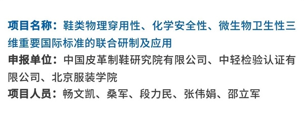 中國皮(pí)革製鞋院聯合申報(bào)的“鞋類(lèi)物理穿用性、化學安全性、微生物(wù)衛生性三維重要(yào)國際標準的(de)聯合研製及應用”項目,主導(dǎo)製定的國際標準ISO19574、ISO20535和ISO19577,打破多年來(lái)歐盟成員國技(jì)術壟斷(duàn),實現我國在鞋類微生物、物理和化(huà)學領域國際標準的突破,填補物理和化學檢測方法標準的國(guó)際空白。