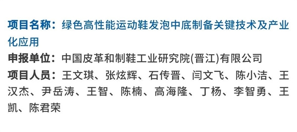 中國皮革製鞋院晉江公司申報的“綠色高性能運(yùn)動鞋(xié)發泡中底製備關鍵技術及產業化(huà)應用”項目,以典型(xíng)鞋用EVA和TPU彈性體為基體,開展了綠色高性(xìng)能運動鞋發泡中(zhōng)底製備(bèi)關鍵技(jì)術及產業化應用相(xiàng)關工作,揭示了相關材料改性調控機製、內在發泡行為及(jí)作用機理。項目(mù)成果填補了製鞋行業在發(fā)泡EVA中底和生物質改性TPU中底領域空白。