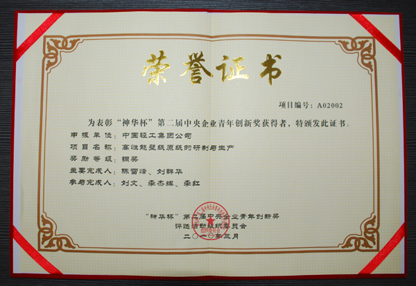 3月30日(rì),“神華杯”第二屆中央企業(yè)青年創新獎表彰大會在京舉行,國資委主任李(lǐ)榮融發表(biǎo)重要講話。中國輕(qīng)工集團公司“高性能壁紙原紙的研製與生產”項目榮獲“神華(huá)杯”第二屆中央企(qǐ)業青年創新(xīn)獎銅獎,該(gāi)項目由中國製漿造紙研究院研究開發部特種紙技術研發中心完成。