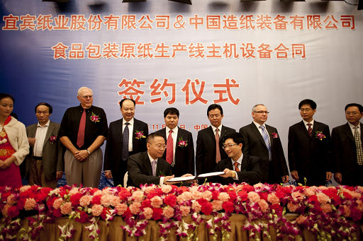 中國造紙裝備公司董事長、總經(jīng)理馬思一、宜(yí)賓紙業董事長易從分別代表雙方公司致辭,宜賓紙業總(zǒng)裁(cái)王曉華和裝備(bèi)公司副總經理周後煉代表雙方簽署合同文本。